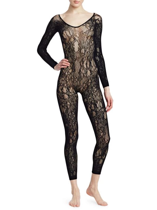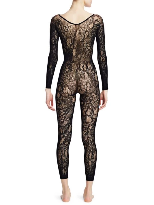 Long-sleeve full-length bodysuit in statement floral lace made of hosiery-like stretch fabric for a streamlined fit.