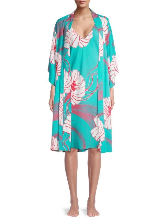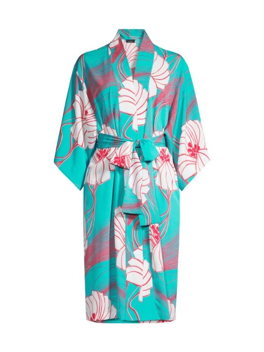 Graphic flowers cover this satin robe, designed with an easy fit to the knee.