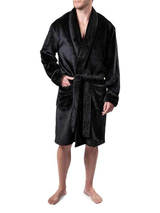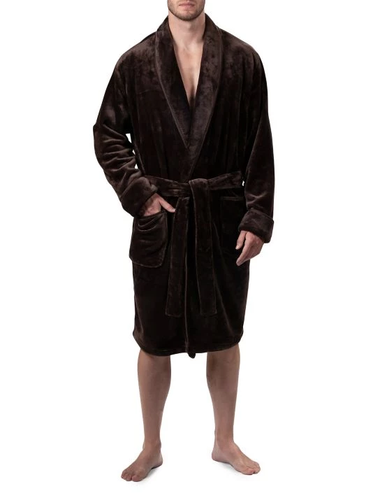 This robe features a soft plush exterior with piping details at the front opening, cuffs, and patch pockets.