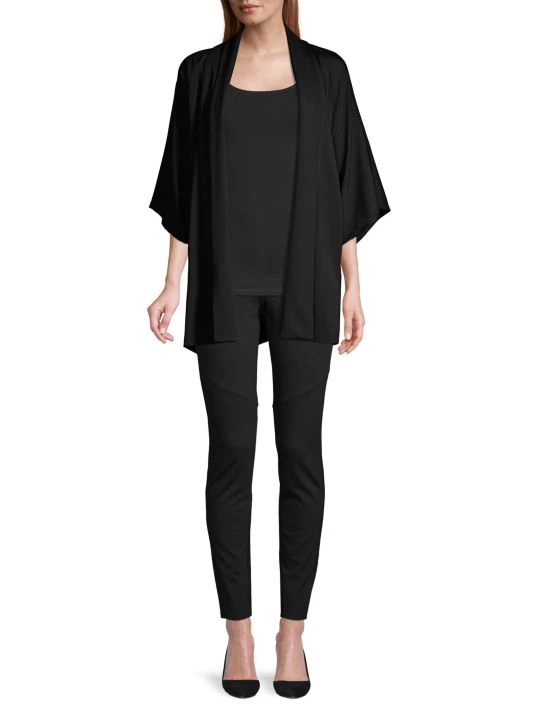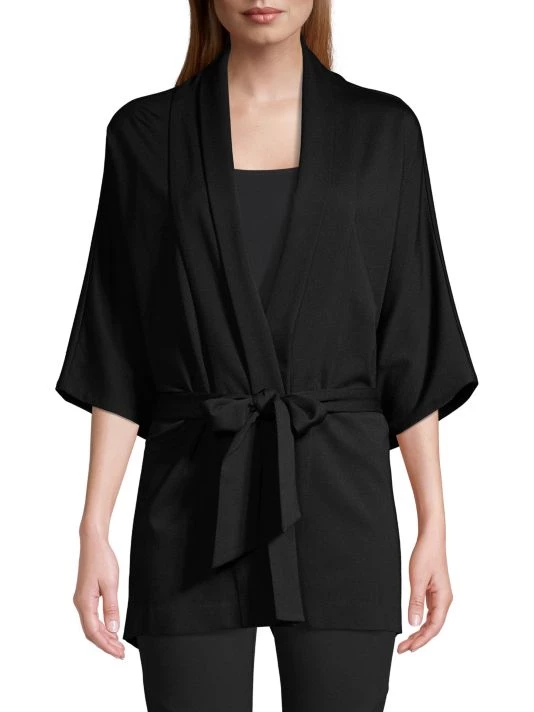 Fashion-forward topper jacket adorn front tie, three quarter sleeves and shawl collar.