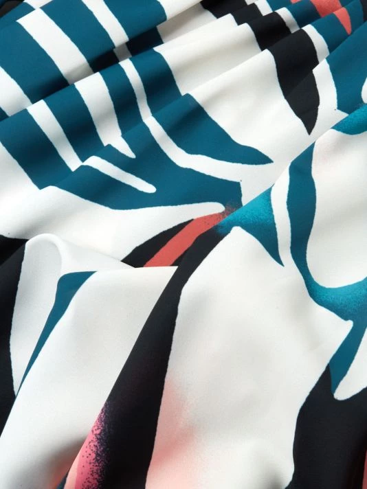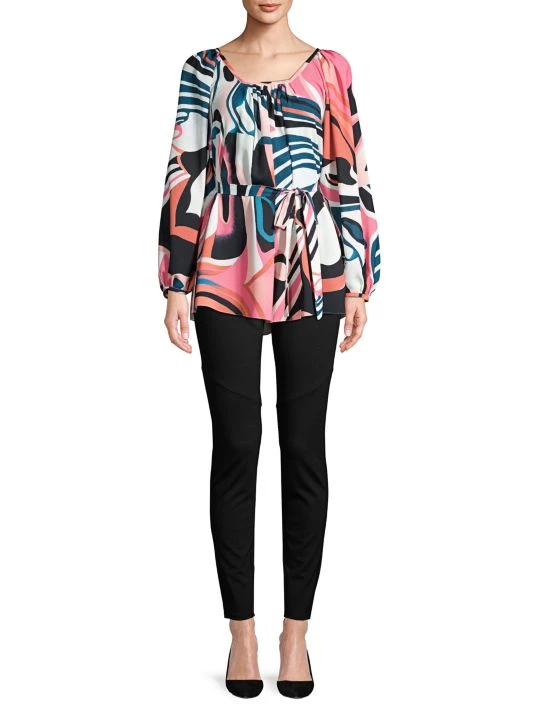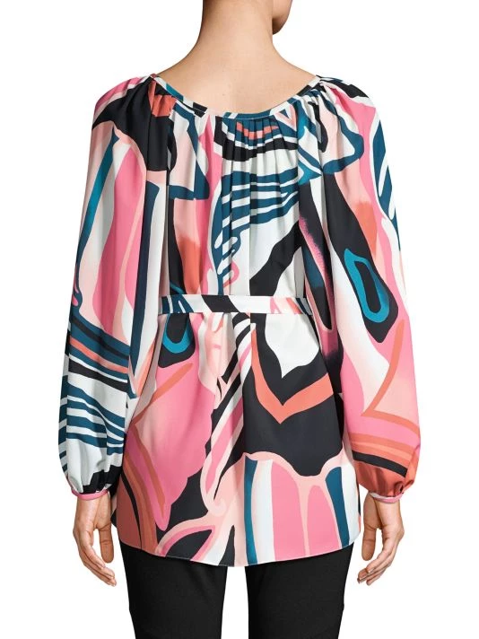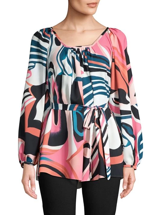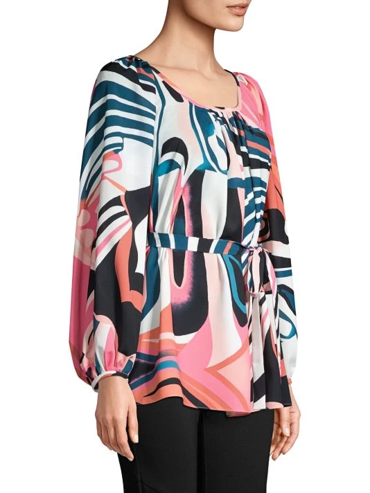 Peasant blouse with an abstract graphic print and waist defining belt.