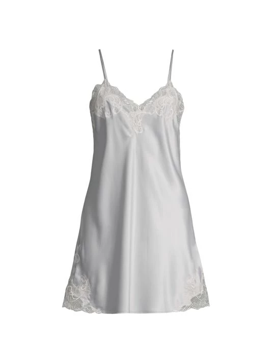 Sultry satin chemise with elegant lace trim at the neck and hem.