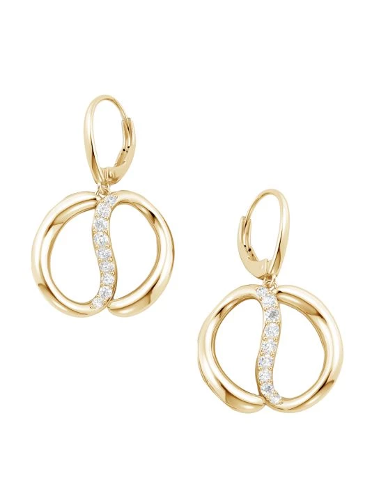 Made of polished 14K yellow gold, Natori’s earrings each feature a Yin-Yang-inspired drop accented with glittering white diamonds.This elegant pair is from the brand’s Shangri-La Collection, a line of jewelry distinguished by its harmonious blend of traditional and contemporary design elements.