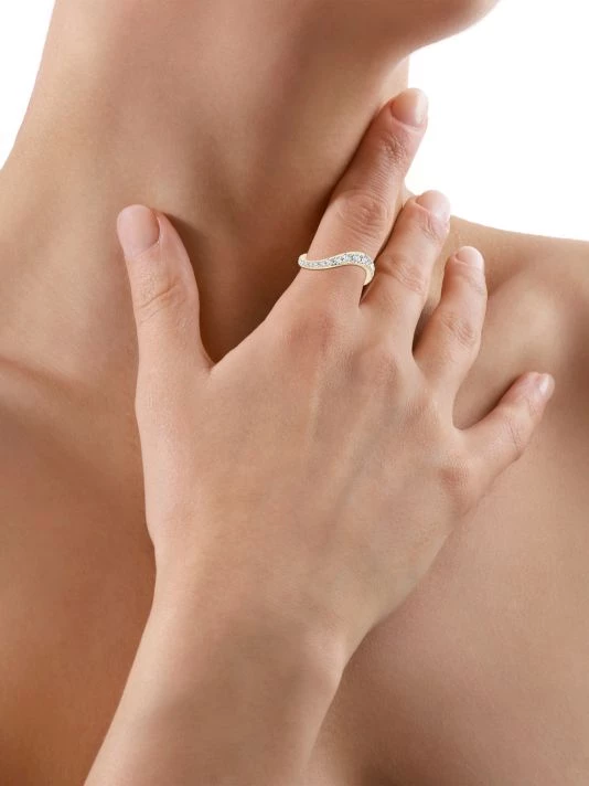 From the Shangri-La: Brushstroke Collection. Graduated diamonds encircle this polished gold ring, designed with a sculptural wavy shape.