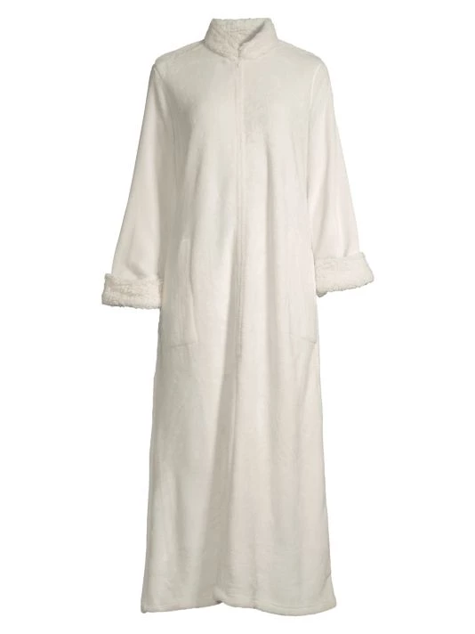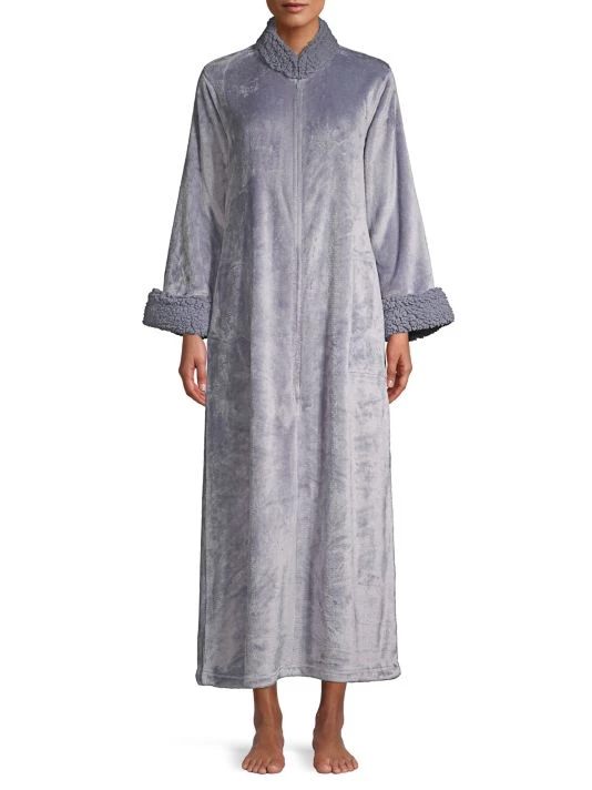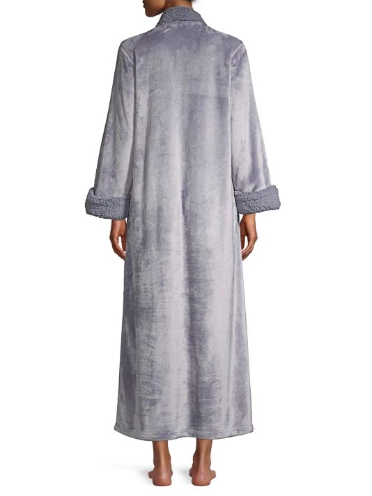 Regal in silhouette, this caftan is crafted in a plush fabrication with faux shearling trim.