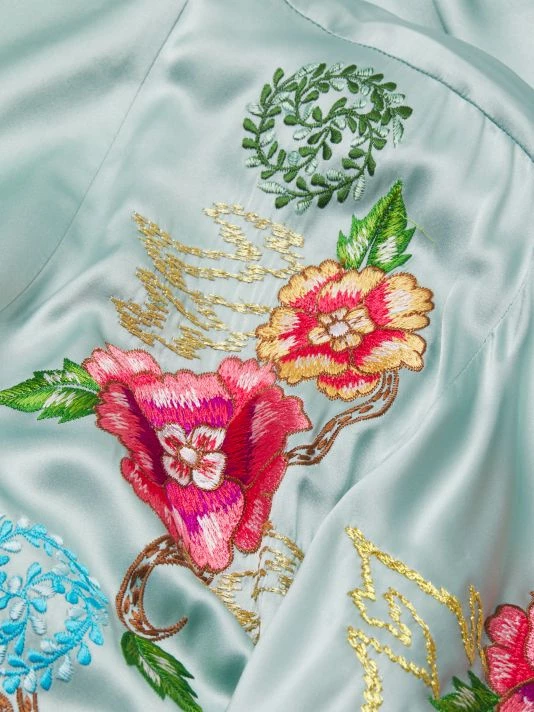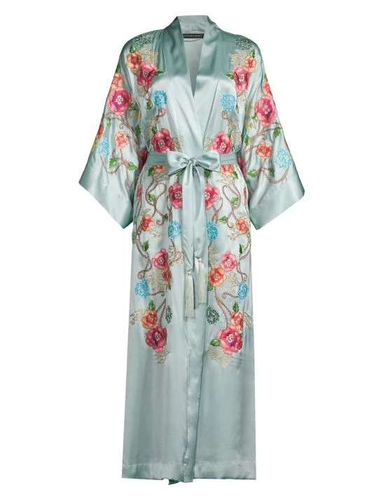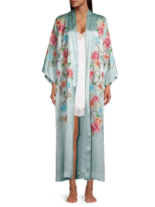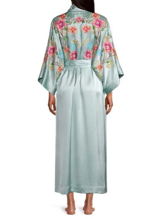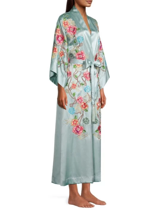 Crafted of smooth silk, this Natori robe is detailed with stunning floral embroidery.