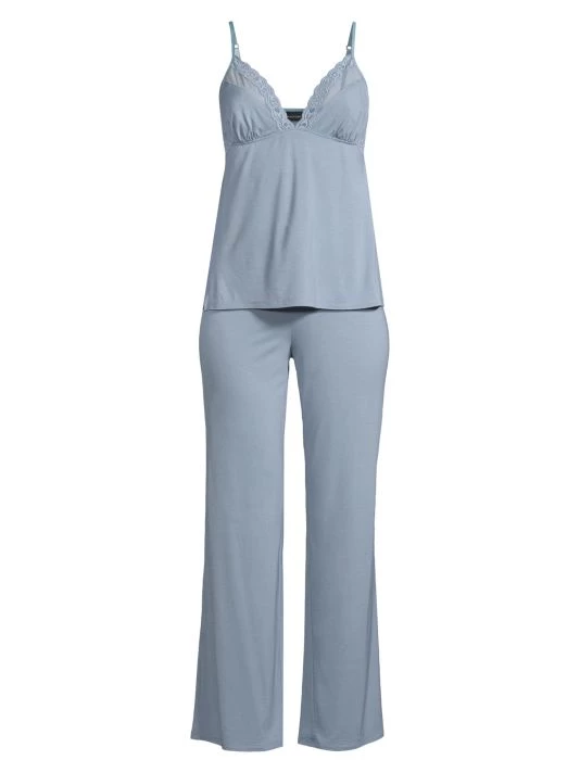 Soft jersey two-piece pajama set features a lace-trimmed cami top with sheer panels at bust and wide-leg pajama pants. 95% viscose/5% spandex. Lace: 92% nylon/8% elastane. Machine wash. Imported.