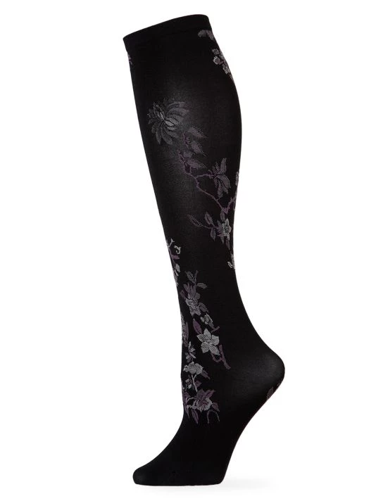 Featuring intricate florals in dramatic relaxation, this pair of knee-highs embrace the comfort of winter while welcoming spring time.
