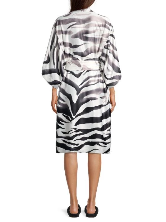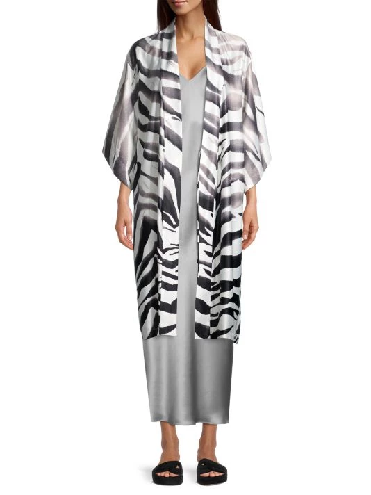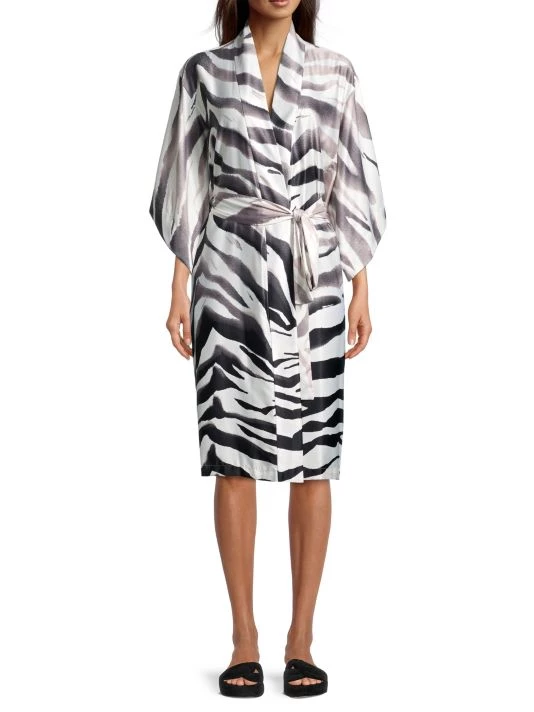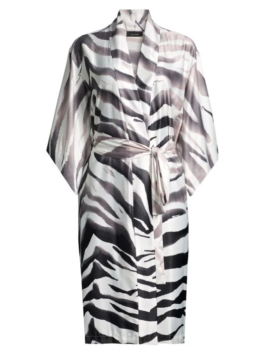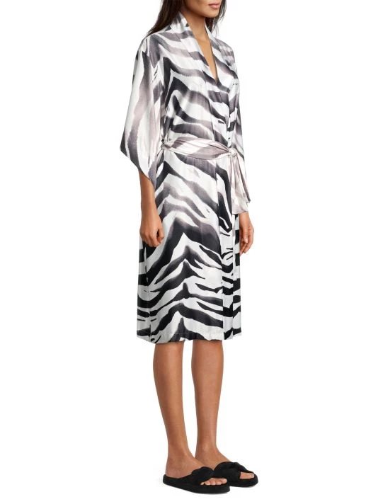From the Tigre Collection. Showcasing a striking zebra-print, this flowing robe features kimono-style sleeves and a sashed waist.