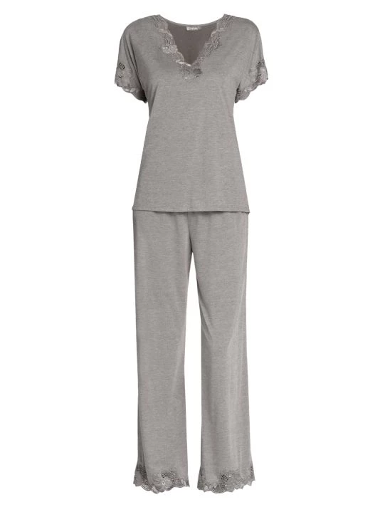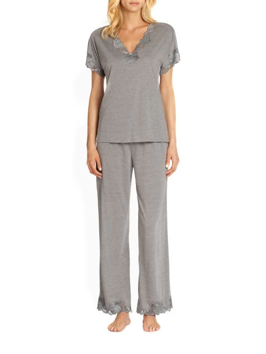 This amazingly soft jersey pajama set is elevated with intricate scalloped lace trim.